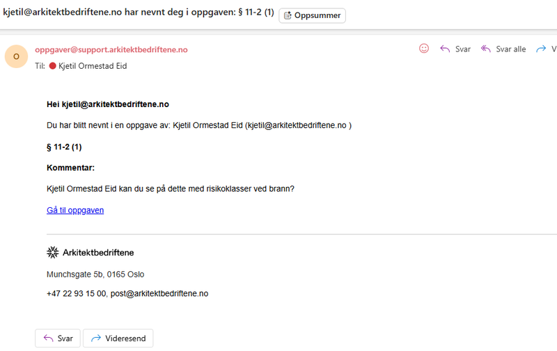 Du kan nå nevne en person direkte i en kommentar på et sjekkpunkt. Personen får da automatisk en e-postvarsling med kommentaren og en direkte lenke til oppgaven.